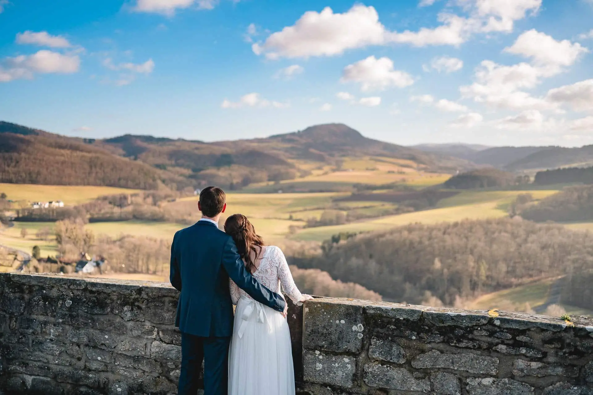 Für mich als Hochzeitsfotograf ist Schloss Bieberstein eine Location mit Geling-Garantie. Der Ausblick von der Schlossterrasse ist schlichtweg atemberaubend – im Hintergrund die sanften, grünen Hügel der Rhön und im Vordergrund ihr beide. Das sind Bilder, die nach Freiheit und Weite schreien.