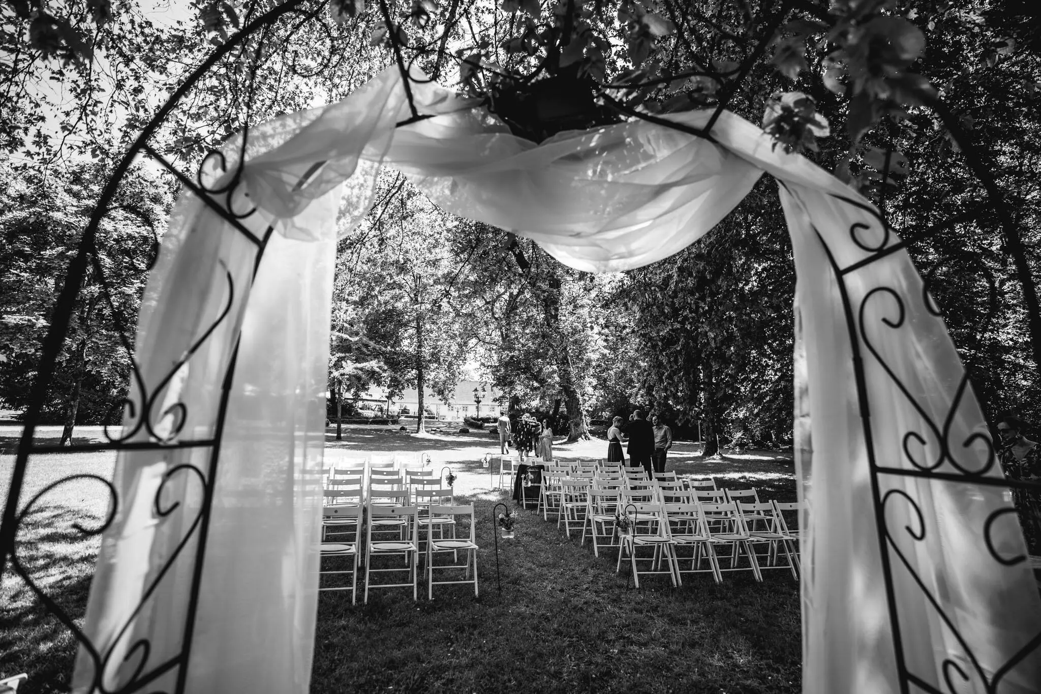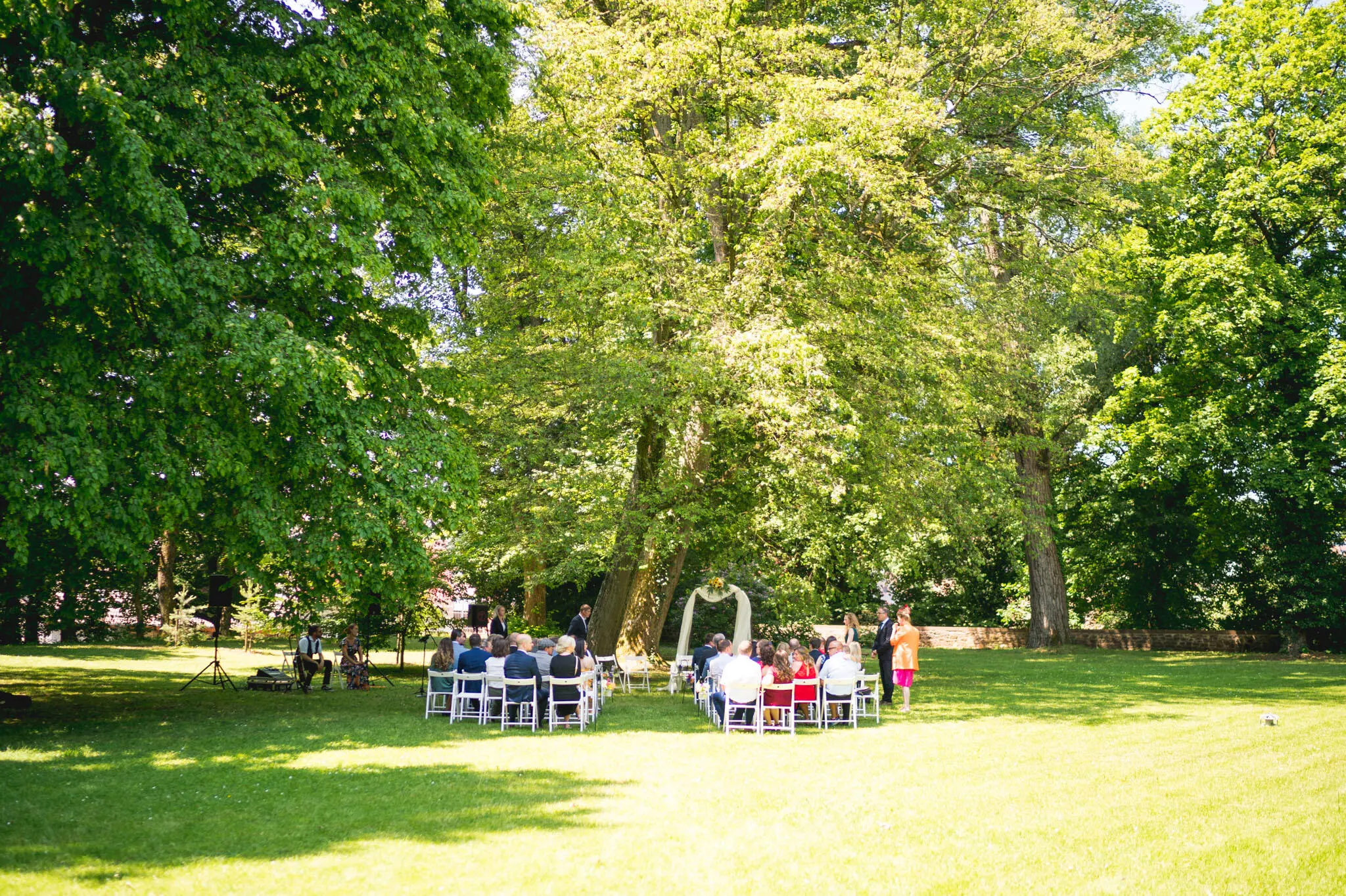 Schloss Gedern macht es uns extrem leicht, abwechslungsreiche und emotionale Aufnahmen zu machen. Direkt vor dem Saal liegt der weitläufige Schlosspark mit seinen jahrhundertealten Baumriesen. Ich liebe es, hier im Schatten der alten Bäume mit dem Paar zu shooten, während die Gäste entspannt beim Sektempfang plaudern. Das weiche Licht unter den Blättern ist ideal für zarte, natürliche Porträts.