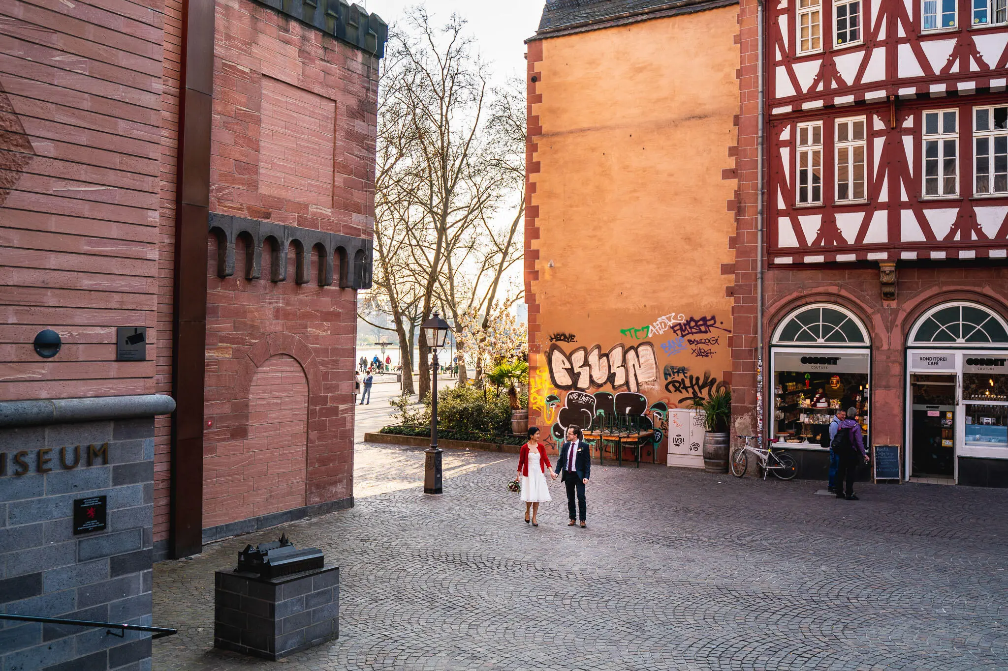 Wenn ihr Frankfurt klassisch und zeitlos wollt, liefert die Altstadt genau das: historische Fassaden, enge Gassen und eine Kulisse, die sofort nach „Frankfurt“ aussieht. Ideal für kurze, ruhige Paarbilder mit Charakter – auch wenn ihr nur wenig Zeit habt.